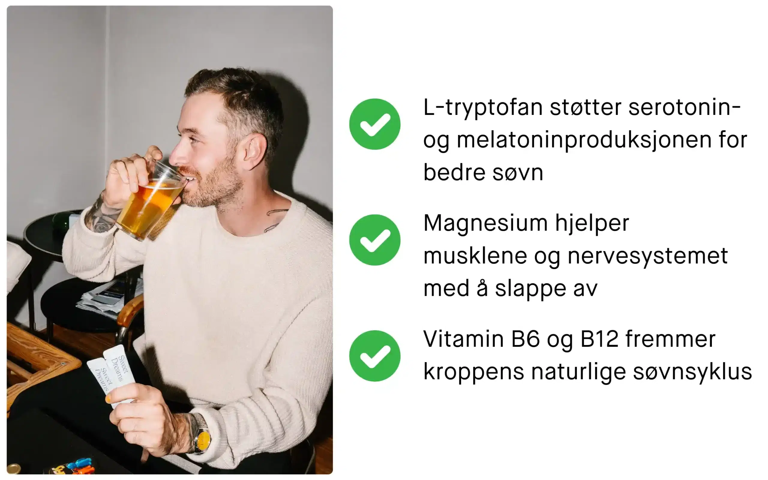 Kosttilskudd for bedre søvn: Visse kosttilskudd kan også hjelpe med å forbedre søvnkvaliteten og øke REM-søvnen. Magnesium er kjent for å fremme avslapning ved å regulere nevrotransmittere som beroliger nervesystemet. L-tryptofan, en aminosyre som kroppen bruker til å produsere serotonin og melatonin, kan bidra til å forbedre søvnkvaliteten ved å øke nivåene av disse søvnfremmende stoffene. Å ta et tilskudd som inneholder magnesium og L-tryptofan kan derfor være fordelaktig for å oppnå en dypere, mer restitusjonsfremmende søvn.