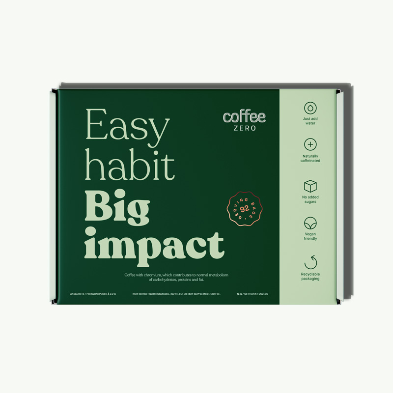 Coffee Zero er en smakfull kaffe som i tillegg er tilsatt krom. Krom bidrar til å stabilisere blodsukkeret, dempe søtsug og gi deg energi. Kaffen er også tilsatt ekstrakt av grønne kaffebønner. Grønne kaffebønner er naturlig rike på antioksidanter og klorogensyre.