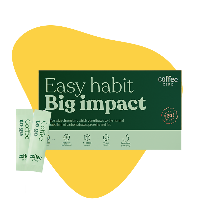 Coffee Zero er en nydelig kaffe tilsatt korm. Krom bidrar til å stabilisere blodsukkeret, dempe søtsug, støtte forbrenningen og gi deg energi.